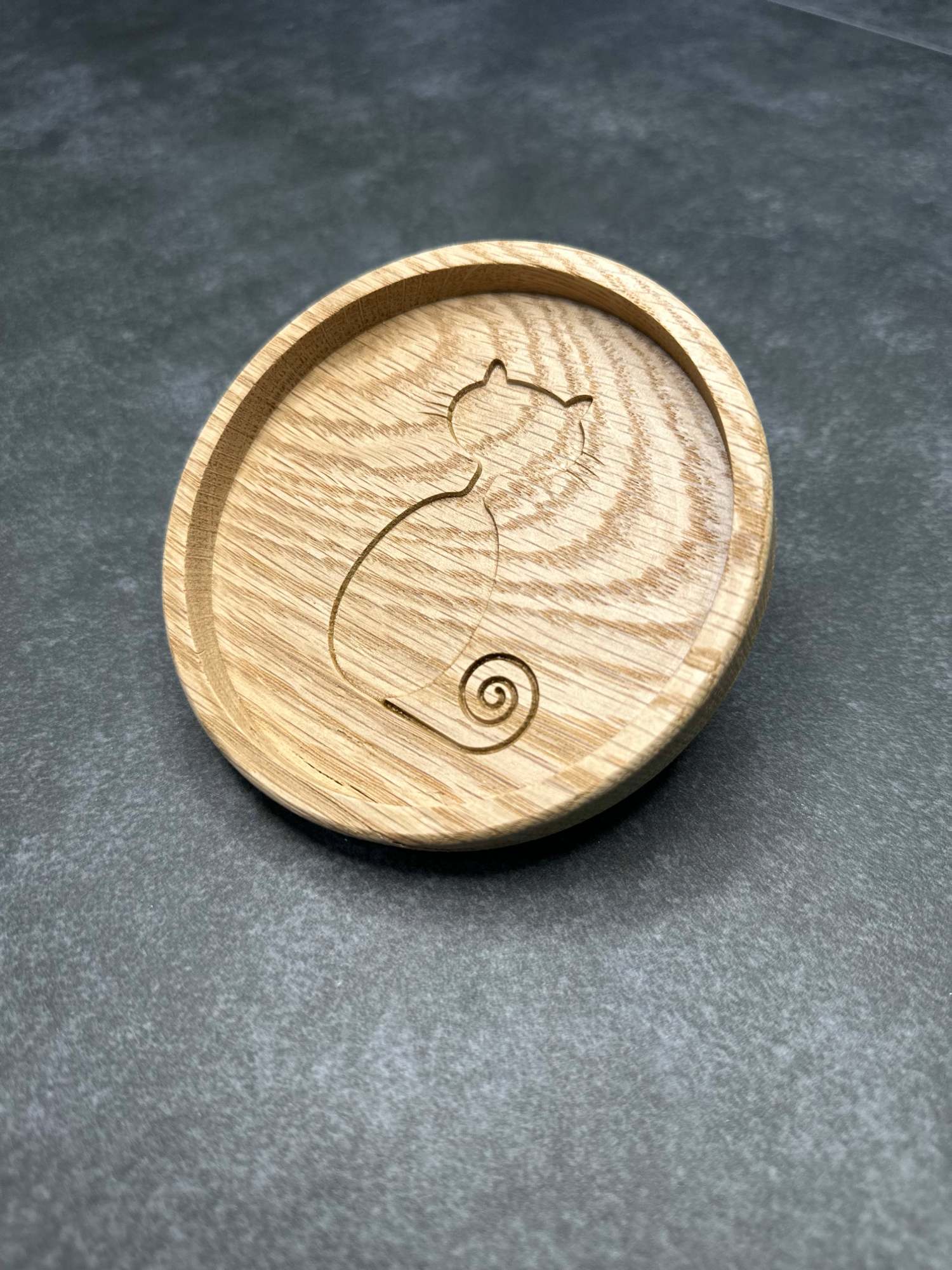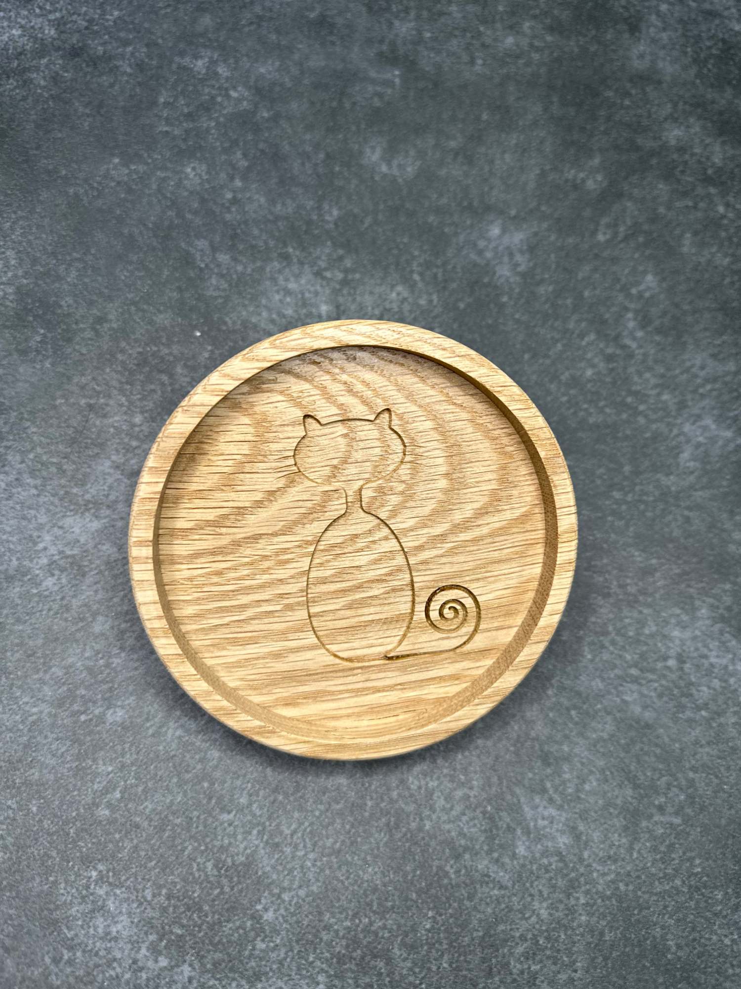 Discover the charm of our Kids Small Jewelry Tray, an adorable and versatile addition to your child's space. Made from the finest white oak, this round tray features a playful cat engraving, making it an instant favorite for your little one. Whether used as a coaster or a jewelry tray, it brings fun and functionality together.