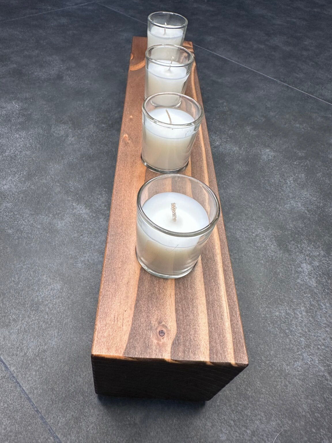 Discover the serene beauty of our 4-Candle Wooden Holder, specifically designed to house-filled glass votive candles. With dimensions of 16 inches in length, 3 1/4 inches in width, and 3 1/4 inches in height, this candle holder is a perfect blend of functionality and aesthetic appeal. It can be used with Tea Lights candles.