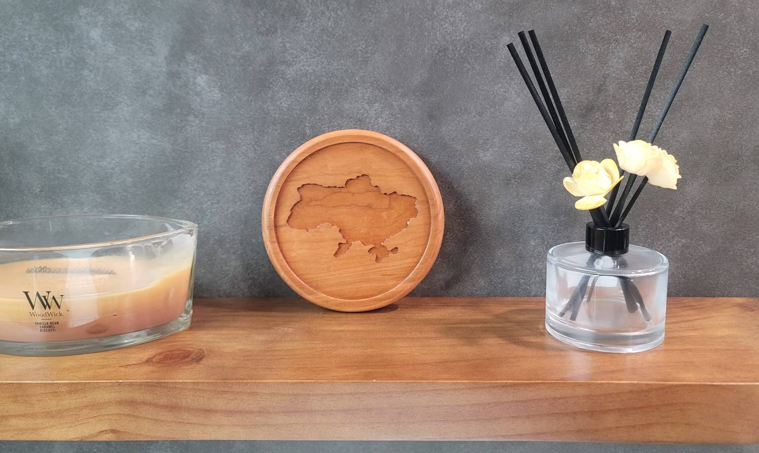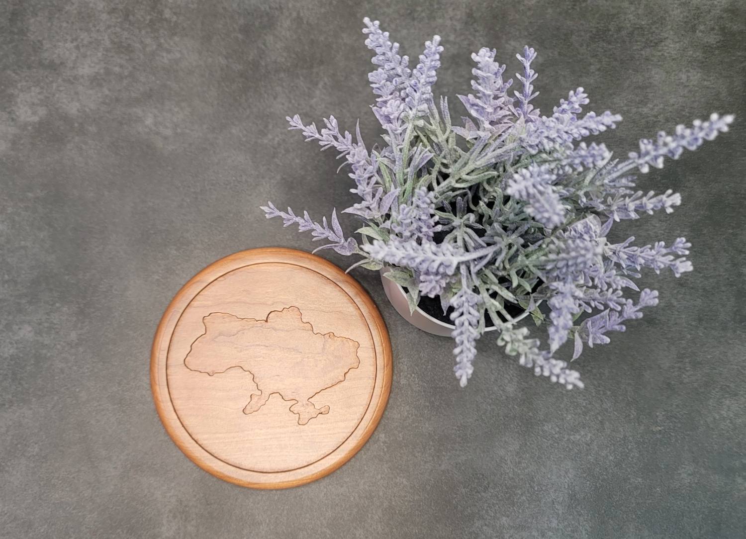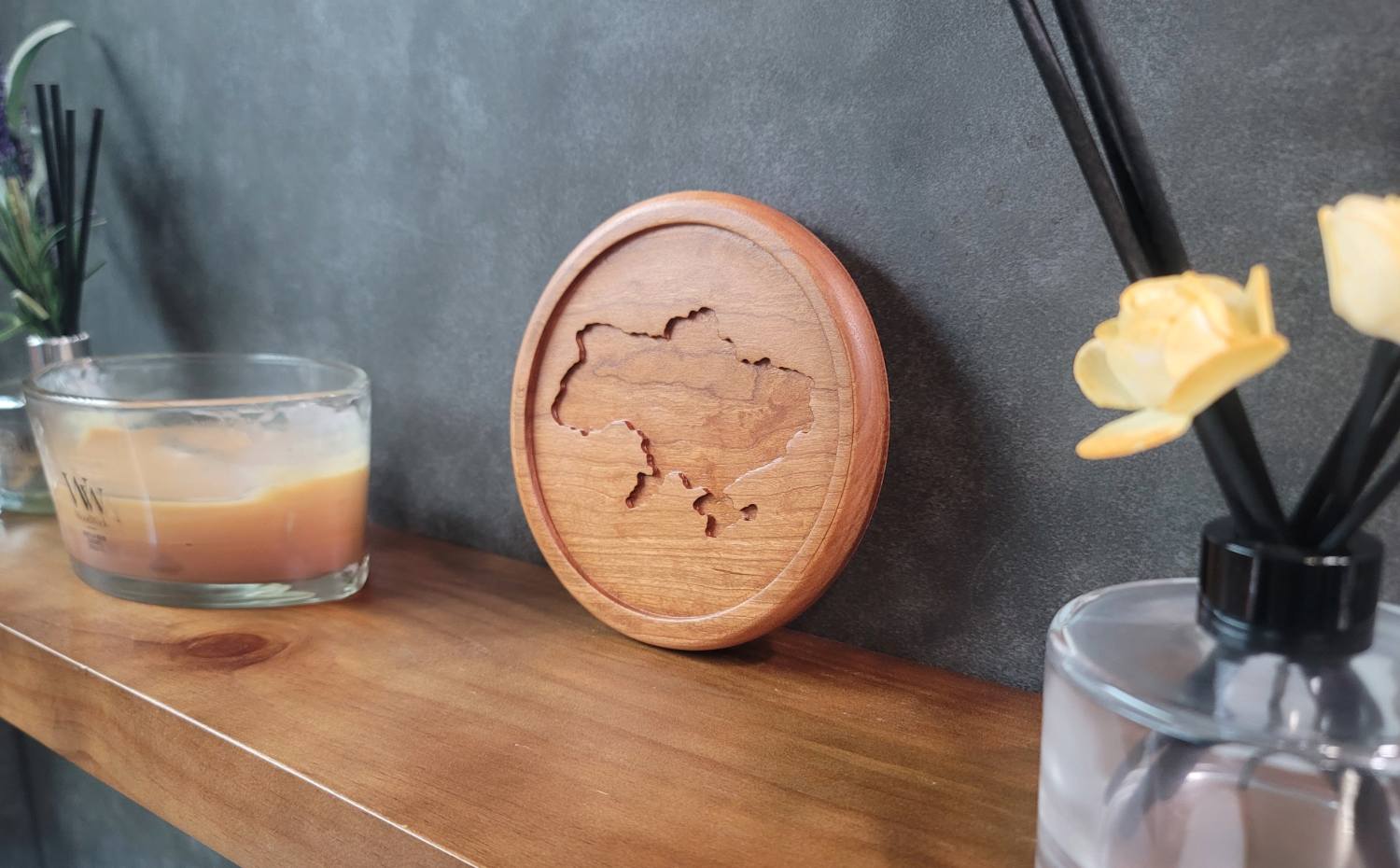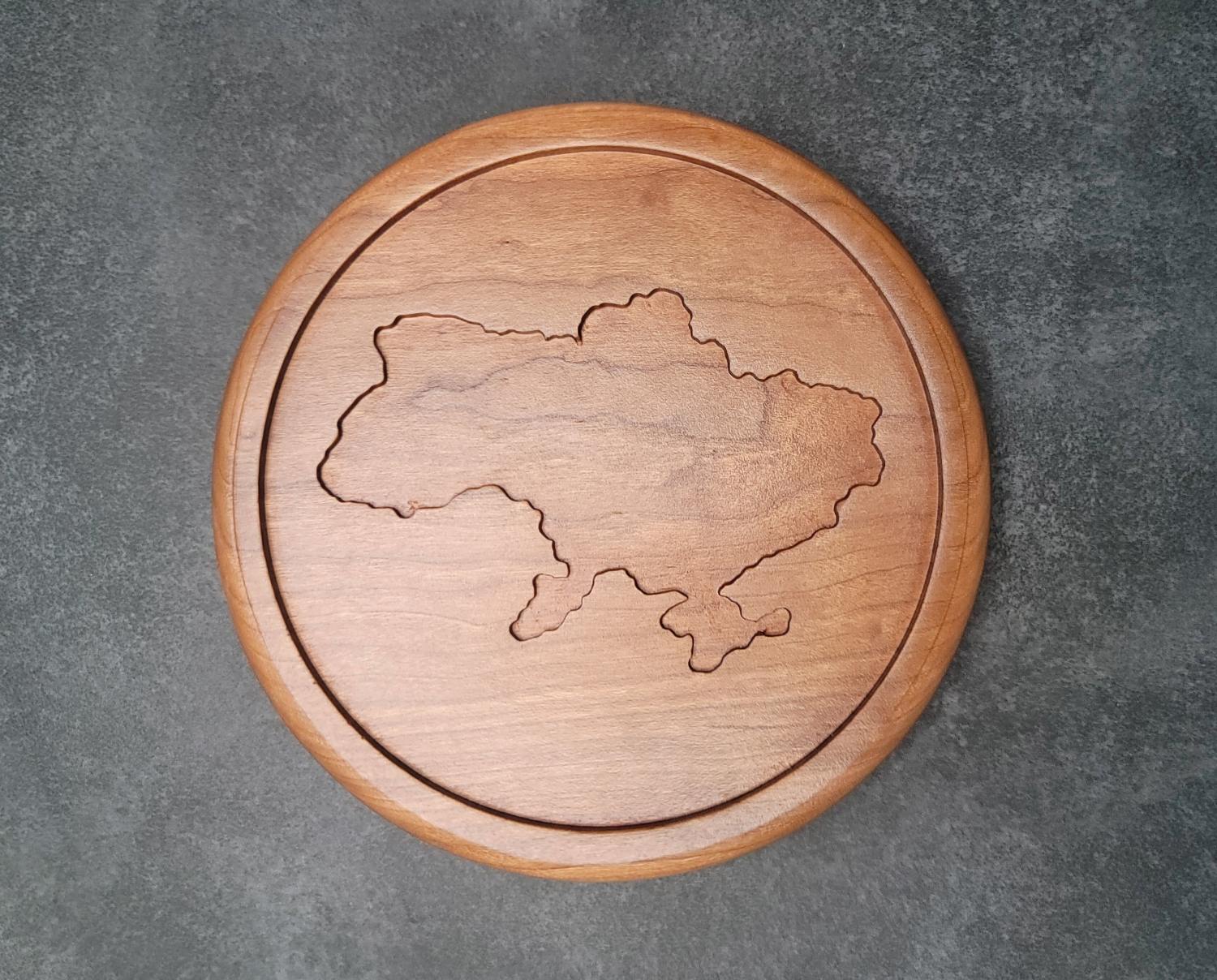Add a touch of elegance and national pride to your home with this beautifully crafted Small Wooden Plate or Tray, made from premium Cherry Wood. Featuring a detailed engraving of the Ukraine country shape, this round plate is perfect as a decorative element to showcase on a shelf, table, or wall. Could be also used as a tray for jewlary storage.